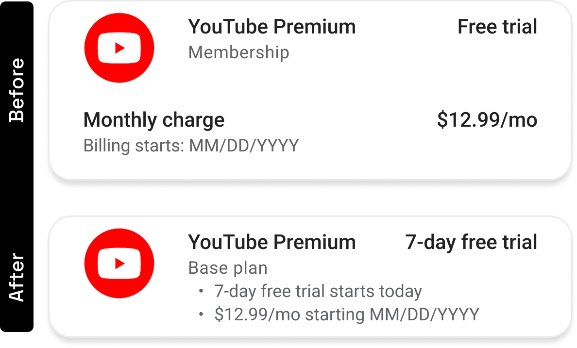 I led the UX redesign of the cart item component for YouTube, addressing significant inconsistencies in how product details, pricing, and discounts were displayed across different product types, including subscriptions and one-time purchases. New design introduced a scalable, templated structure, standardizing pricing and simplifying the display of product details. This improved user experience and reduced engineering complexity by establishing a reusable cart framework.