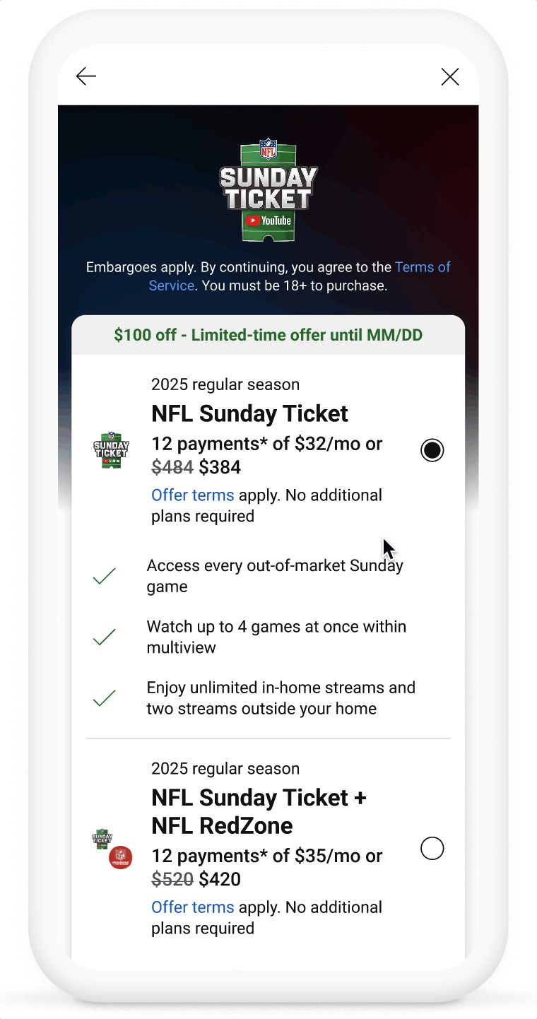 NFL Sunday Ticket is a premium, subscription-based season pass available exclusively on YouTube and YouTube TV attracting millions of subscribers each year. To make the service more accessible, YouTube provides flexible payment options, allowing users to pay in a one-time lump sum or monthly installments. As the lead designer for the installments feature, I played a key role in shaping this payment experience to increase user signups.